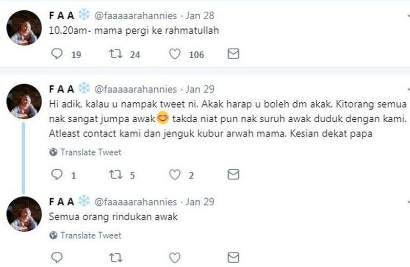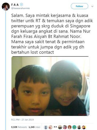 Menurut anak perempuannya, Nur Farahhanis Rahmat Noor, 22, ibunya itu sebelum ini pernah menyatakan hasrat untuk berjumpa adik perempuannya, Nur Farah Firras Aisyah Rahmat Noor, 19, selepas sembilan tahun terpisah daripada keluarga kandung.