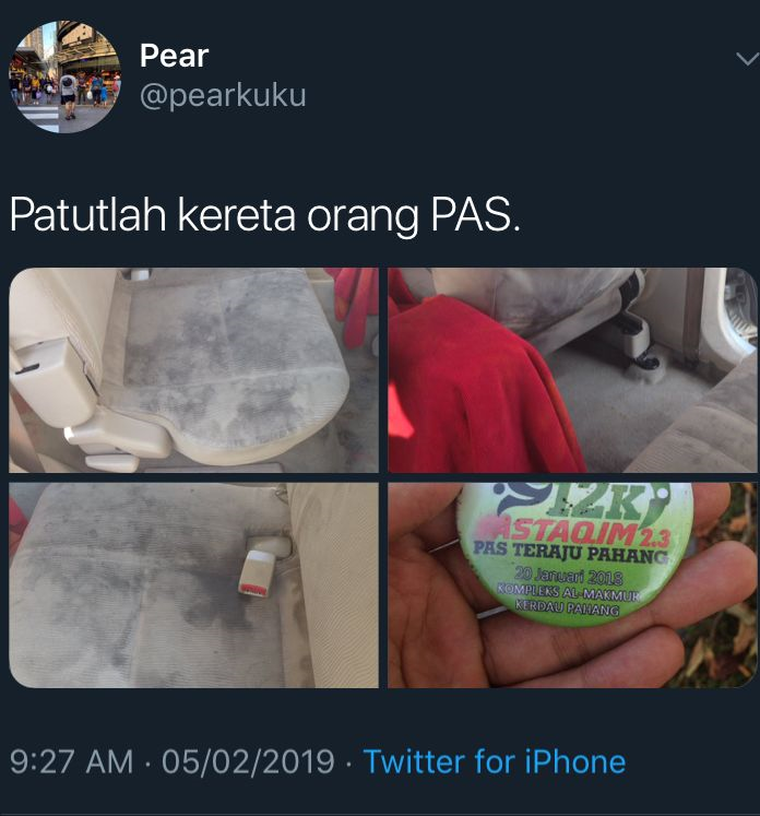 Itulah yang berlaku kepada seorang pengusaha perkhidmatan cuci kereta gara-gara postingnya mengenai keadaan kereta milik sebuah parti politik di pantai Timur yang dimuatnaiknya di Twitter dengan kapsyen 'Patutlah kereta orang PAS' telah mengundang kecaman netizen.