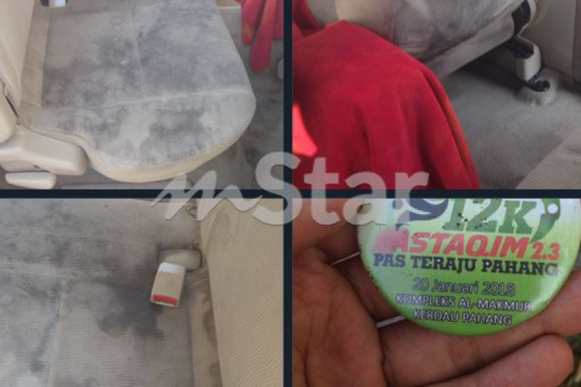 Gambar yang dimuat naik pengguna akaun @Pearkuku menunjukkan keadaan kusyen tempat duduk yang agak kotor selain pin lencana parti politik tersebut.