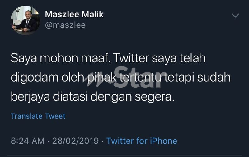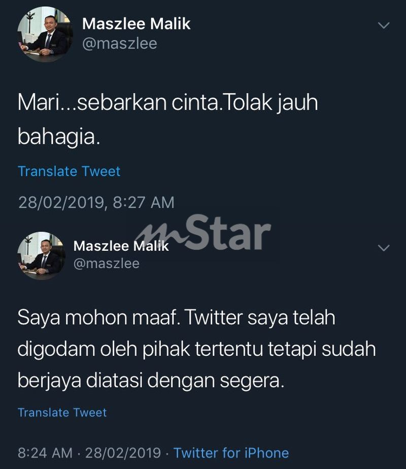 "Saya mohon maaf. Twitter saya telah digodam oleh pihak tertentu tetapi sudah berjaya diatasi dengan segera," jelas Maszlee menerusi posting terbaharu yang dimuat naik pada pagi Khamis.