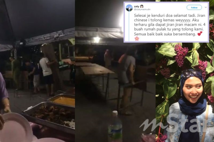 Video berdurasi 15 saat yang dikongsi Mas Diana Izzaty Masmudin menyaksikan empat pasangan suami isteri berbangsa Cina sedang membantu mengemas khemah dan peralatan kenduri di Taman Lapangan Indah Ipoh, Perak pada malam Ahad.