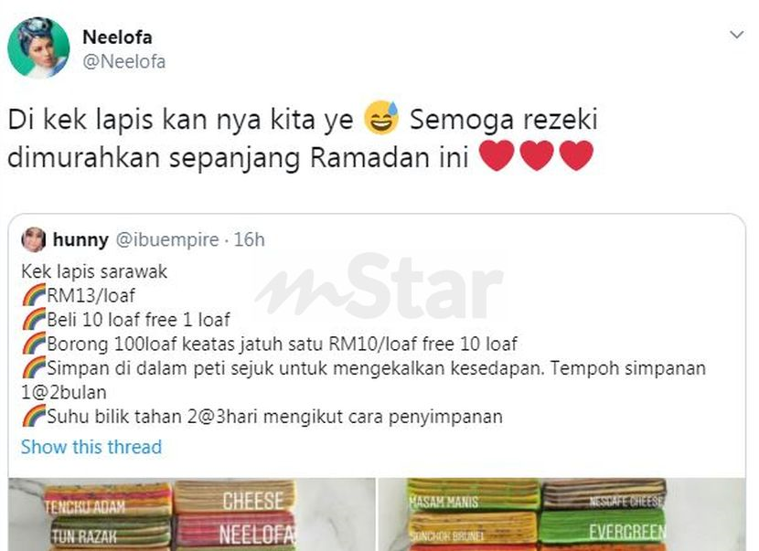 “Di kek lapiskannya kita ye? Semoga rezeki dimurahkan sepanjang Ramadan ini,” menurut Neelofa di akaun Twitter miliknya pada malam Isnin sehingga menjadi tular.