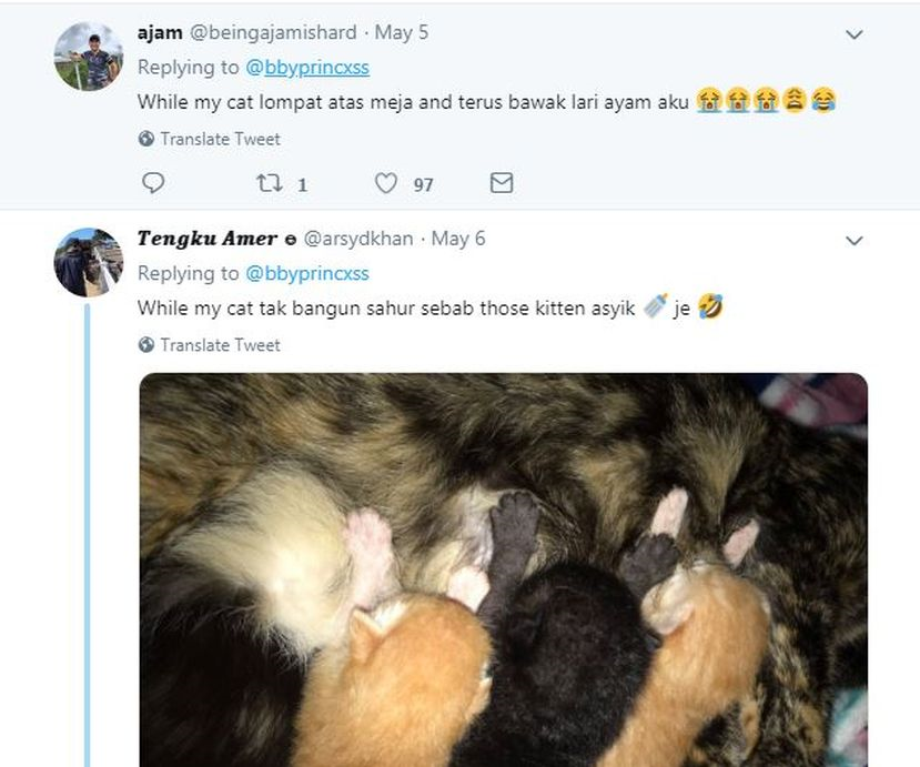 Bebepara pengguna Twitter turut berkongsi gambar kucing mereka pada waktu sahur di ruangan komen Twitter.