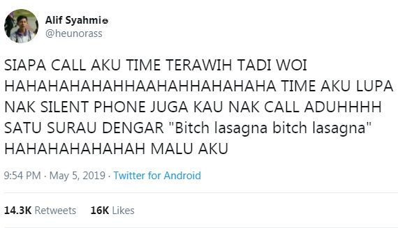 "Waktu tengah berdiri baca al-Fatihah, tiba-tiba phone yang saya letak atas lantai depan saya berbunyi. Dahlah ringtone macam apa... lagu oleh PewDiePie - B***h Lasagna.
