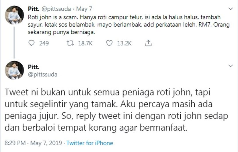 Perkongsian Pitt itu mendapat lebih 18,000 ulang kicau dan banyak cadangan lokasi untuk dapatkan Roti John lebih sedap dan berbaloi.