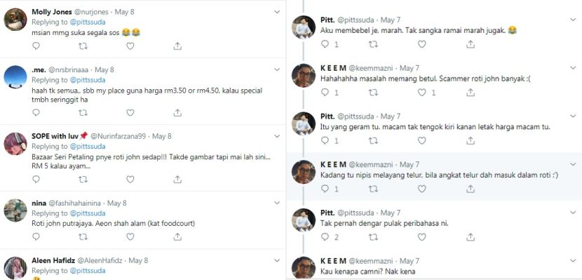 Menurut seorang penggemar Roti John, yang hanya mahu dikenali Pitt, dia begitu kecewa apabila harga juadah itu dijual pada harga RM7 di sebuah bazar di sekitar Kuala Lumpur tetapi isinya hanya ada telur, sos dan mayonis semata-mata.