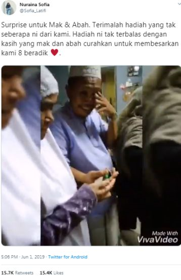 Sofia yang berasal dari Seri Manjung, Perak memuat naik rakaman video mengenai reaksi kedua ibu bapanya semasa menerima kejutan hadiah itu di Twitter petang Sabtu.