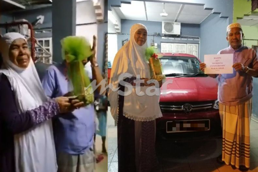 Salah seorang anak perempuan pasangan warga emas ini, Nuraina Sofia, 22, memberitahu mereka adik-beradik dan menantu sepakat menghadiahkan kereta tersebut sempena ulang tahun perkahwinan ke-39 tahun ibu bapa mereka.