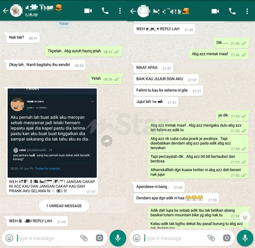 "Tapi percayalah dik. Abang Azz betul-betul dah bertaubat dan berdosa. Alhamdulilah dengan kuasa Twitter ni Abang Azz dah berani nak jujur," balas lelaki itu kepada adiknya.