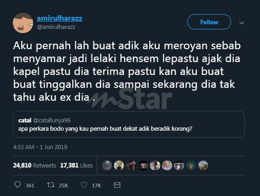 "Aku pernah lah buat adik aku meroyan sebab menyamar jadi lelaki handsome lepas tu ajak dia couple pastu dia terima pastu kan aku buat tinggalkan dia sampai sekarang dia tak tahu aku ex dia," tulis lelaki itu menerusi akaun yang didaftarkan atas nama @amirulharazz.