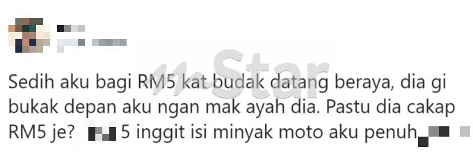 “Sedih aku bagi RM5 kat budak datang beraya, dia gi buka depan aku dengan mak ayah dia. Pastu dia cakap RM5? RM5 isi minyak motor aku,” menerusi perkongsian seorang pemuda di laman sosial Twitter sehingga menjadi tular.