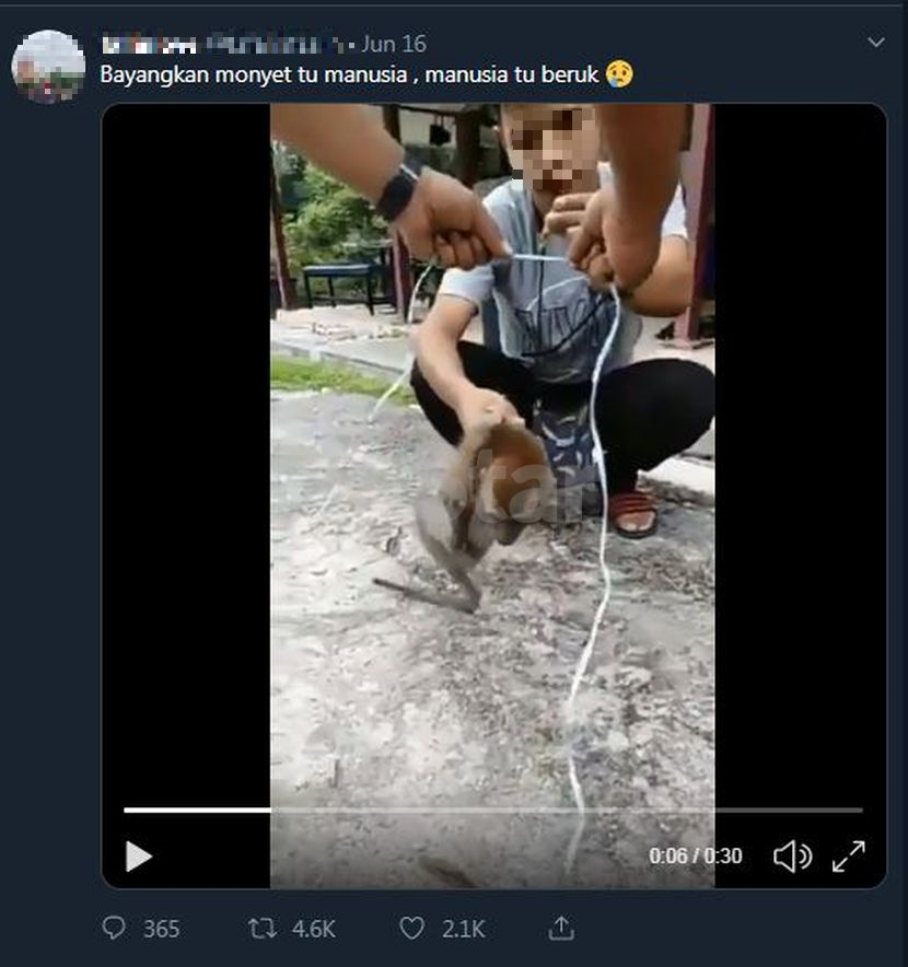 "Nak menangis tengok kesian monyet tu ya Allah," tulis seorang lagi pelayar Twitter.