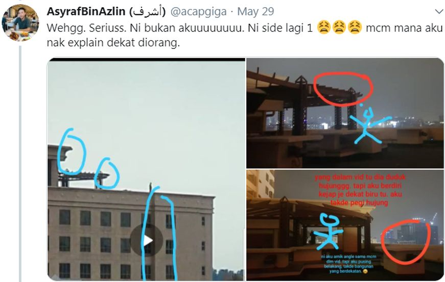 "Saya pun duduk... saya tengok video, saya ambil gambar dan buat lukisan 'bulat-bulat'. Memang tak sama langsung. Saya pusing bangunan tu sorang-sorang waktu malam. Saya check dari tempat saya berdiri memang tak sama. Saya check sudut satu lagi tempat cleaner tadi berdiri memang sama macam dalam video.