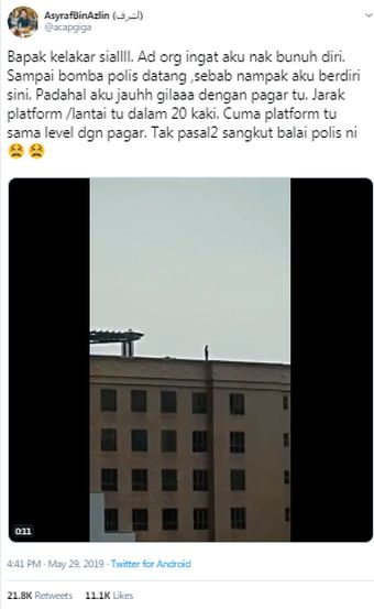 Susulan itu pemuda yang disangka mahu bunuh diri itu yang dikenali sebagai Asyraf Azlin berkongsi pengalaman cemas tapi kelakar yang dilaluinya menerusi satu bebenang di Twitternya.