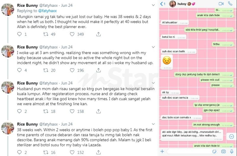 "Kata doktor, denyutan nadi anak saya sudah tak ada. Saya terus hantar mesej pada suami yang menunggu di luar bilik rawatan. Untuk memuaskan hati kami, doktor buat lagi pemeriksaan terakhir dan mereka mengesahkan bayi kami sudah meninggal dunia," ujar ibu muda itu yang terus menangis apabila dimaklumkan mengenai berita sedih itu.