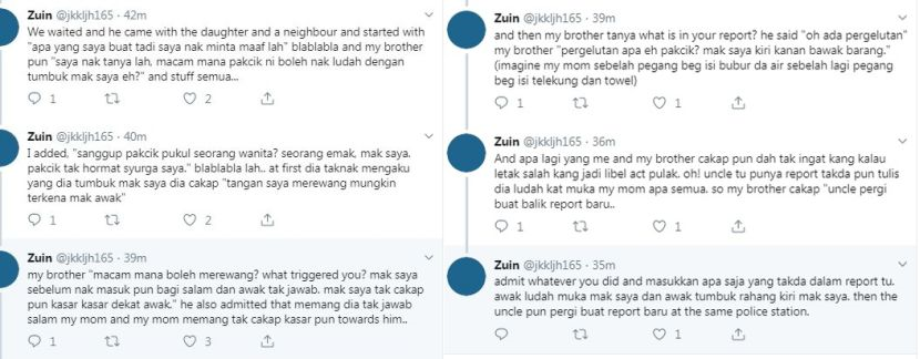 "Laporan uncle tu tak ada pun tulis dia ludah dan lain-lain kat muka ibu. Jadi abang saya menyuruh dia pergi buat report baru," katanya.