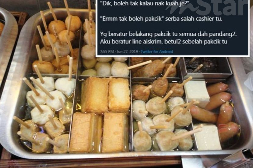 "Masa saya tengah beratur nak beli aiskrim, ada seorang pakcik minta nak beli kuah Oden sahaja. Gaya pakaian macam dia kerja kilang.