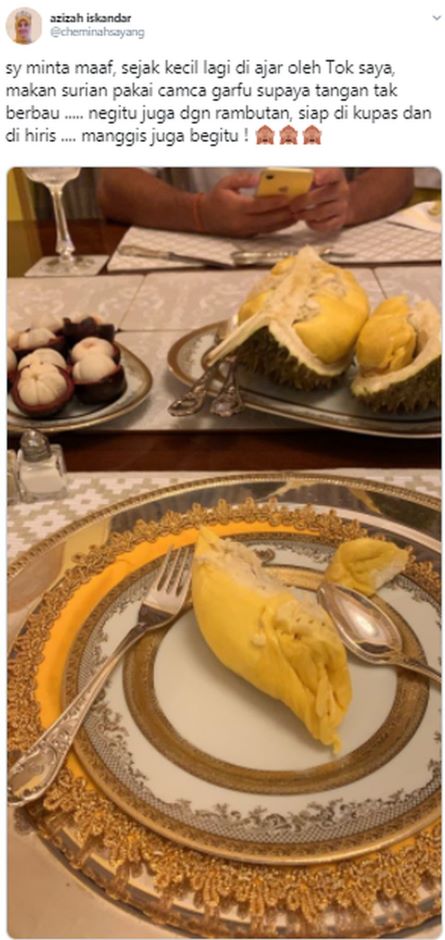 "Saya minta maaf, sejak kecil lagi diajar oleh tok saya makan durian pakai camca garfu supaya tangan tak berbau.