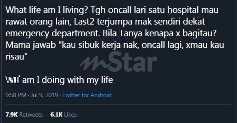 Kisah mengenai doktor berusia dalam lingkungan 20-an itu dikongsi menerusi laman Twitter sehingga menerima lebih 7,000 ulang kicau (Retweet).