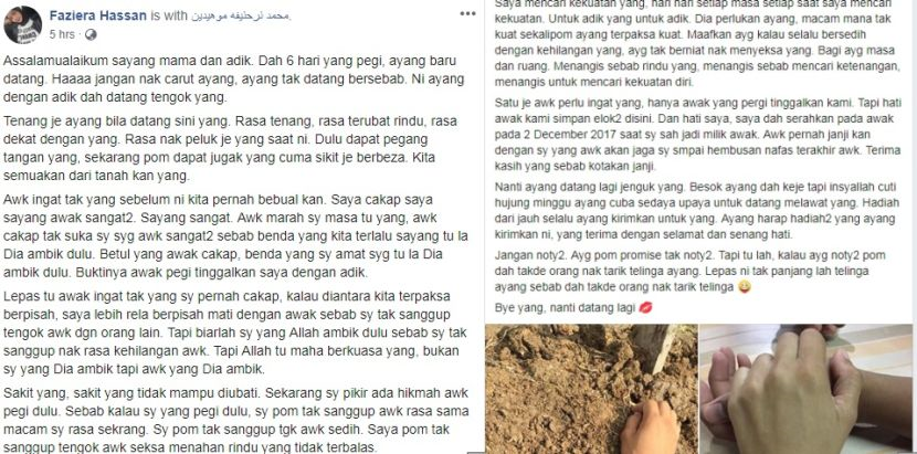 Posting luahan hati Faziera ketika melawat pusara suaminya Jumaat lalu itu mendapat lebih 600 perkongsian.