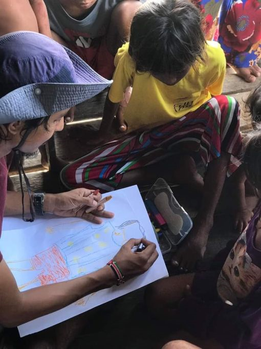 Khairul mengajar generasi muda komuniti Bajau Laut melakukan aktiviti melukis.