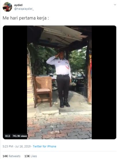 "Jadinya kalau nampak security guard muka-muka macam ni, jangan main-main dengan depa. Lagi-lagi yang pakai uniform ketat perut ke depan tu silap cakap mau kena cota dengan depa. Kalau depa cakap no, no lah untuk kita. Yes, yes lah untuk kita. Tabik Bahador!," katanya.