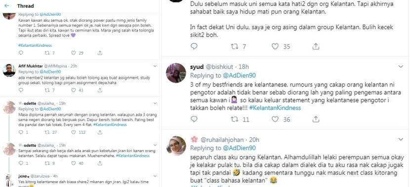Tweet Ad-Dien itu juga menjadi tular dan mendapat pelbagai komen positif daripada mereka yang berkongsi pengalaman mengenai rakyat Kelantan.