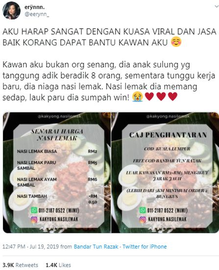 Posting mengenai Nasi Lemak KakYong yang diusahakan Mimi dan ibunya menjadi tular selepas dikongsi rakannya bernama Eryn.