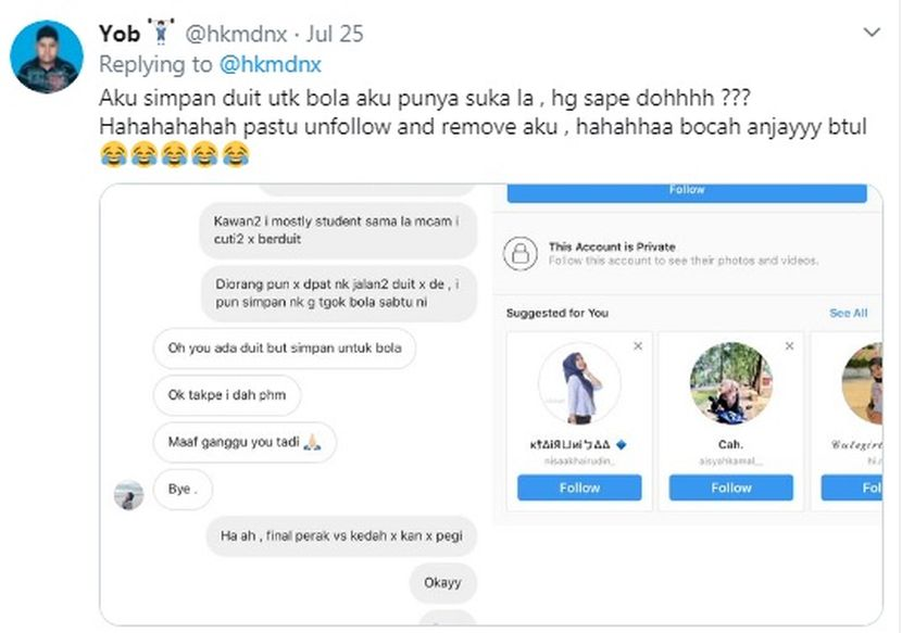 "Satu hari selepas saya menolak permintaannya, dia 'remove' dan 'block' saya. Sebelum itu dia ada cakap bahawa akaun Instagram dia kena 'hack'.