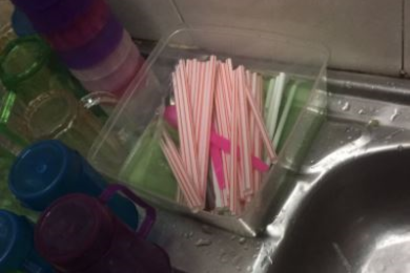 Sekeping gambar yang dikongsikan di laman sosial Twitter menunjukkan selonggok straw plastik yang direndamkan di dalam bekas berisi air sabun.