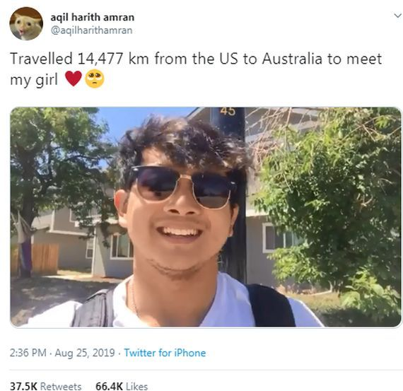 Video yang dimuatnaik Aqil yang juga pelajar di Universiti of Colorado Boulder, AS dengan kapsyen 'Travelled 14,477 km from the US to Australia to meet my girl' turut mendapat 35,900 ulang kicau dan 63,500 tanda suka.