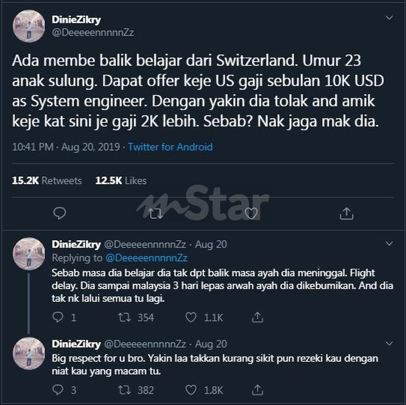 "Dengan yakin dia tolak dan ambil kerja kat sini je (Malaysia) gaji RM2,000 lebih. Sebab? Nak jaga mak dia," tulisnya.