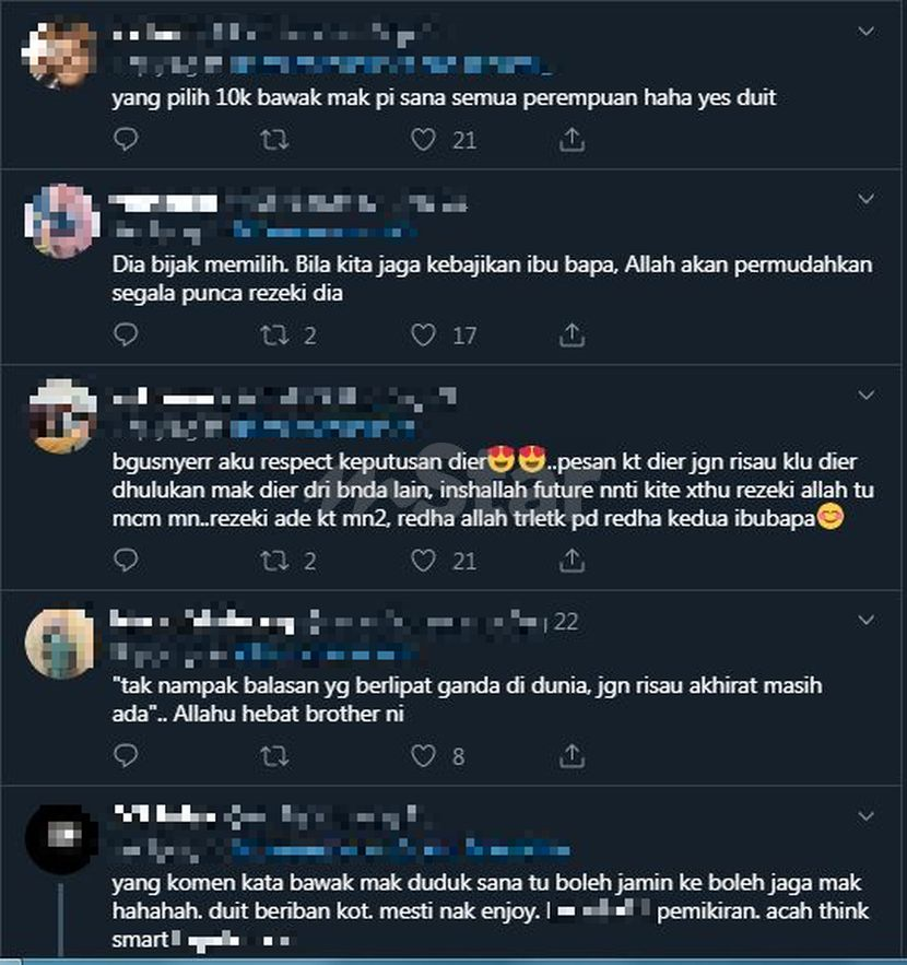 Selain menyokong tindakan individu tersebut yang mendahulukan ibunya, tidak kurang juga yang menganggap dia melepaskan peluang keemasan untuk bekerja di AS.