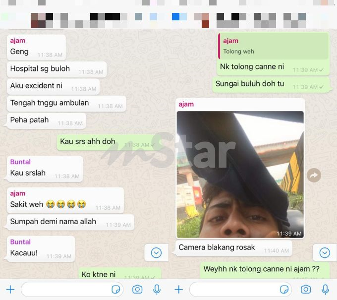 “Menerusi grup sembang Whatsapp, Ajam sempat beritahu kami dan rakan-rakan lain yang dia terbabit kemalangan, tengah tunggu ambulans datang.
