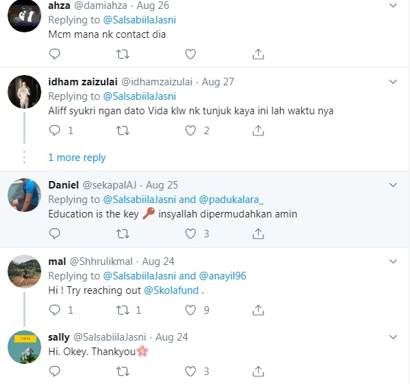 Rata-rata pengguna Twitter yang lain turut memberi respon untuk membantu melancarkan urusan Fazelah dan keluarganya di universiti nanti.