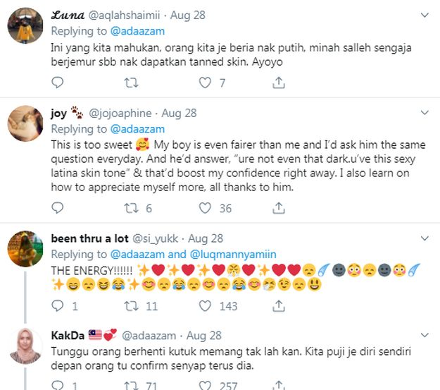 Menerusi perkongsian seorang wanita dikenali sebagai Ada Azam di Twitter, dia meluahkan rasa kurang yakin berkulit gelap sehinggalah bertemu suaminya yang menghargai keistimewaannya itu.
