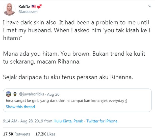 Perkongsian 'I have dark skin also. It had been a problem to me until I met my husband. When I asked him ‘you tak kisah ke I hitam?’ Mana ada you hitam. You brown. Bukan trend ke kulit tu sekarang, macam Rihanna. Sejak daripada tu aku terus perasan aku Rihanna' mendapat 16,900 ulang kicau dan 16,600 tanda suka.