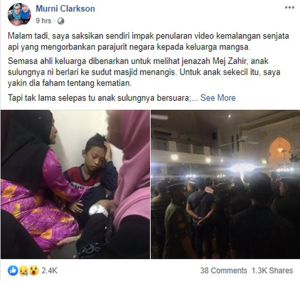 Menerusi perkongsian Murni Clarkson di Facebooknya, dia bercerita mengenai impak penularan video membabitkan pegawai komando itu kepada anak sulung Allahyarham yang disaksikannya sendiri pada malam Rabu.