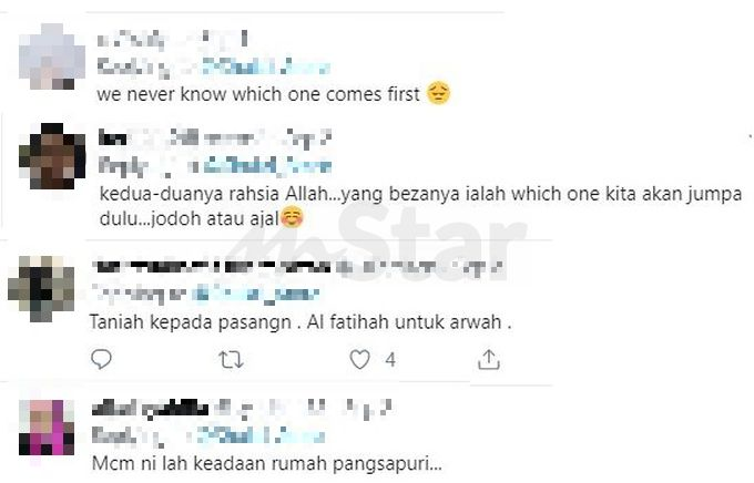 “Kedua-duanya rahsia Allah... yang bezanya ialah mana satu kita akan jumpa dulu... jodoh atau ajal,” tulis seorang netizen memberikan pandangan.