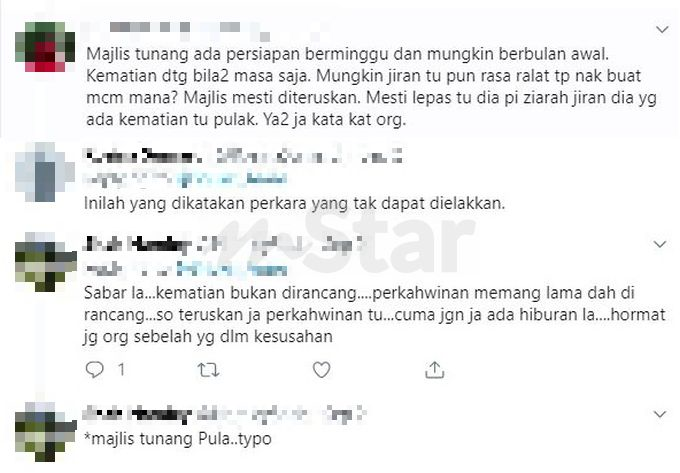 “Majlis tunang ada persiapan berminggu dan mungkin berbulan awal. Kematian datang bila-bila masa saja. Mungkin jiran tu pun rasa ralat tapi nak buat macam mana? Majlis mesti diteruskan. Mesti lepas tu dia pergi ziarah jiran dia yang ada kematian tu pula,” ujar seorang netizen yang memahami keadaan dialami kedua-dua jiran.