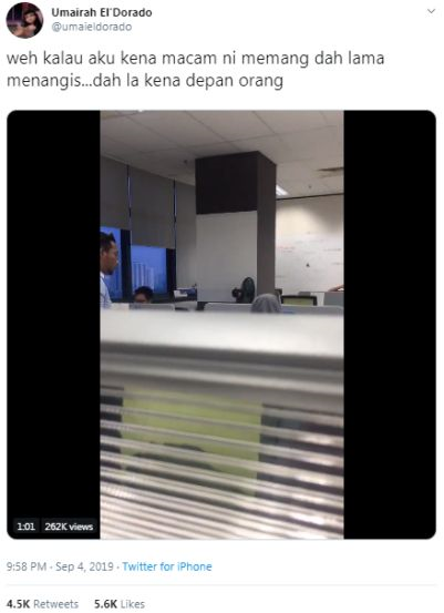 Video dengan kapsyen 'Weh kalau aku kena macam ni memang dah lama menangis... dah lah kena depan orang' mendapat hampir 300,000 tontonan sejak dimuatnaik malam Rabu.