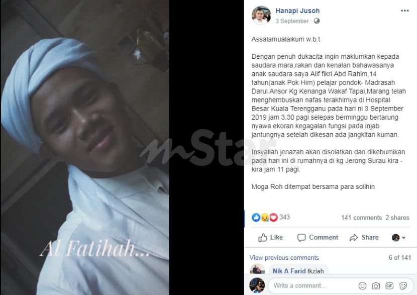 Salah satu posting Hanapi mengenai kematian anak saudaranya.