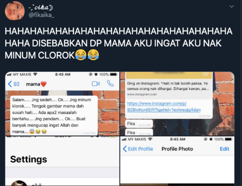“Saya jawab mana ada minum klorox. Rupanya mama tengok DP saya gambar kucing minum klorox. Jadi dia pun risaukan saya,” ujar Fika kepada mStar.