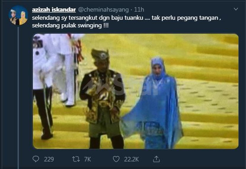 "Selendang saya tersangkut dengan baju tuanku. Tak perlu pegang tangan, selendang pula swinging," tulis baginda menerusi Twitter.