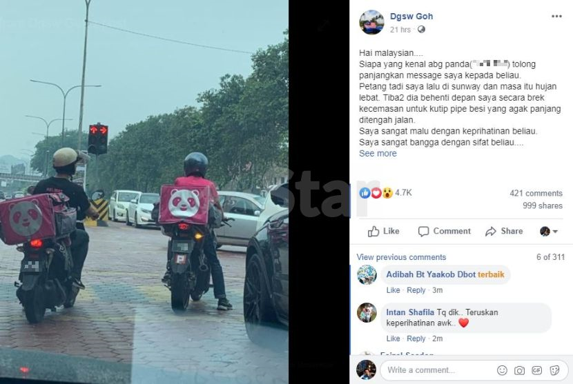 KEPRIHATINAN seorang pekerja khidmat penghantaran makanan Foodpanda yang bertindak membuang paip besi di laluan berdekatan Sunway, Subang Jaya di Selangor menerima pujian ramai.