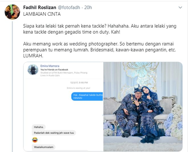 Bercerita lebih lanjut, Fadhil berkata sepanjang lima tahun bergelar jurufoto perkahwinan, dia tidak pernah terbayang untuk diminati atau ditackle.
