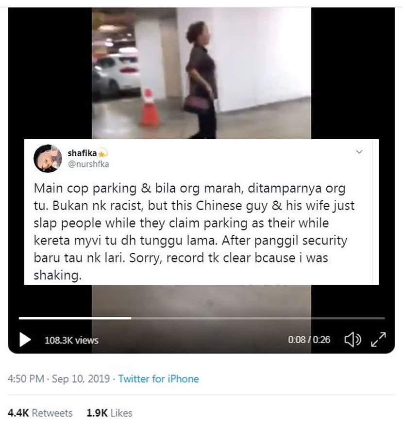 Pada Rabu, tular satu video berdurasi 26 saat yang memaparkan seorang wanita berbangsa Cina berdiri di dalam ruang tempat letak kereta sebagai tanda 'cop parking'.
