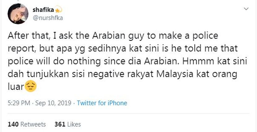 "Saya pun beritahu pasangan Arab ini supaya segera buat laporan, tapi lelaki Arab ni dakwa pihak polis hanya akan ambil report je, takkan ada apa-apa tindakan sebab dia bangsa Arab bukan rakyat Malaysia," katanya yang kali pertama berdepan dengan situasi seperti ini sehinggakan membuatnya berasa sedikit gementar.