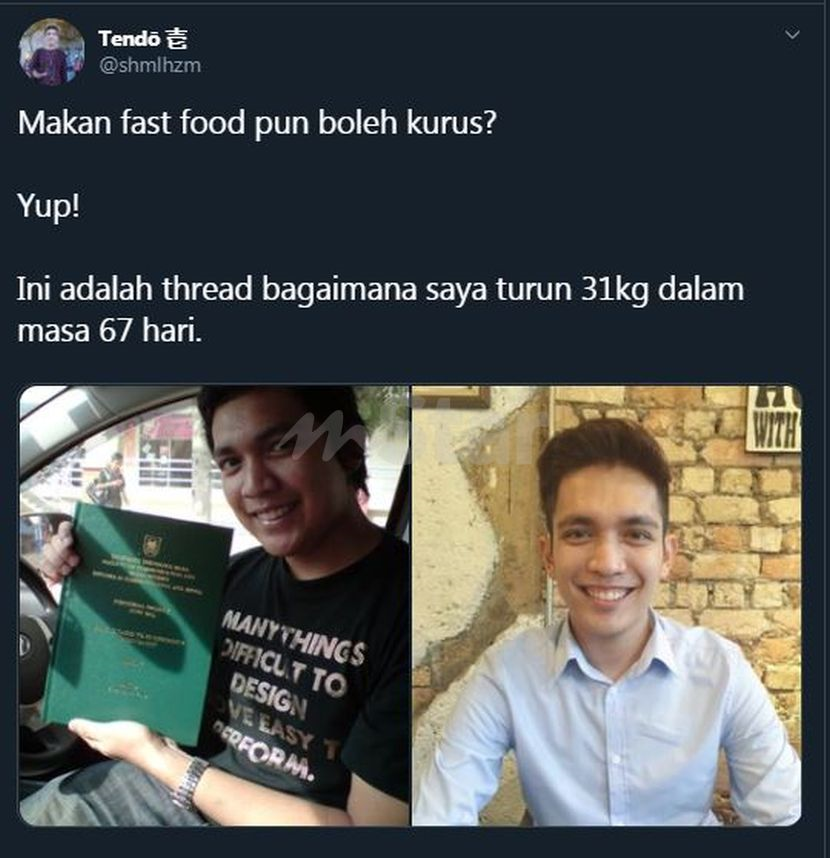 "Makan fast food pun boleh kurus? Yup! Ini adalah thread bagaimana saya turun 31kg dalam masa 67 hari," tulis Mohamed Shamil Hizamie sehingga menerima lebih 5,200 ulang kicau (Retweet).