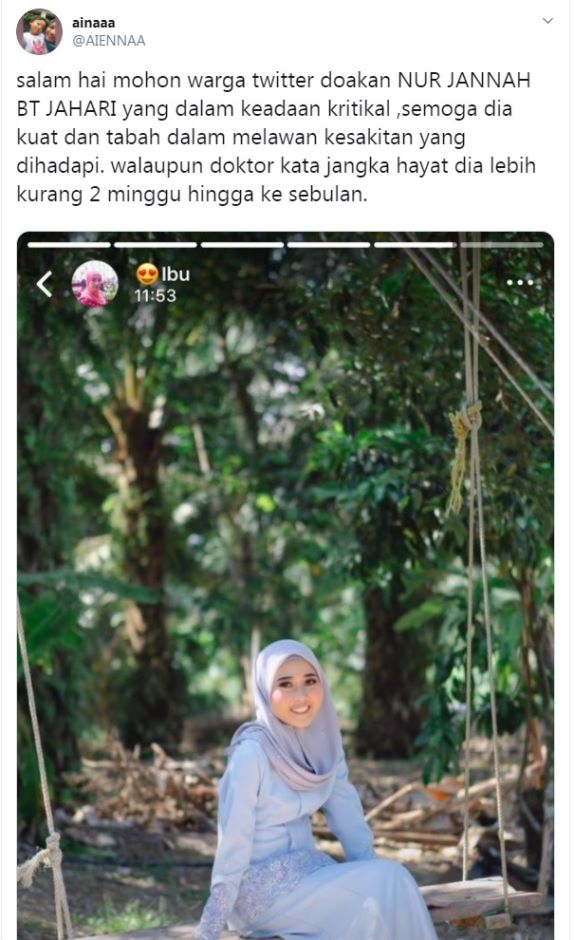 "Beberapa bulan lalu Nur Jannah memang mengadu sakit di bahagian perut. Keluarganya dah bawa ke hospital. Mula-mula di pergi ke hospital di Johor Bahru dan diberitahu dia mengalami kekurangan darah kuning.